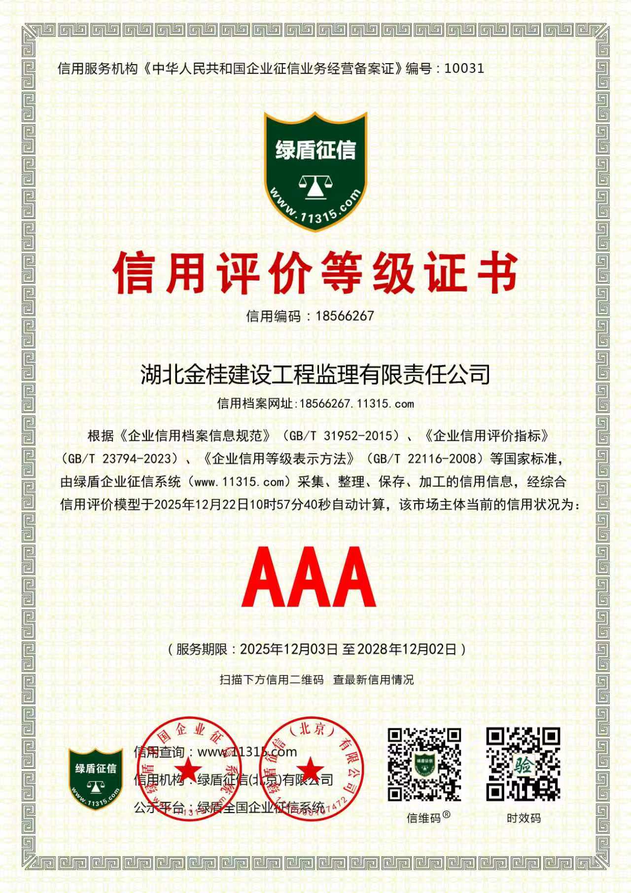 2025年AAA信用评价等级证书